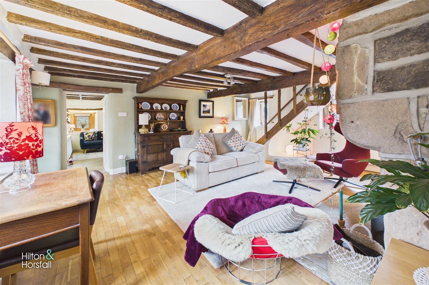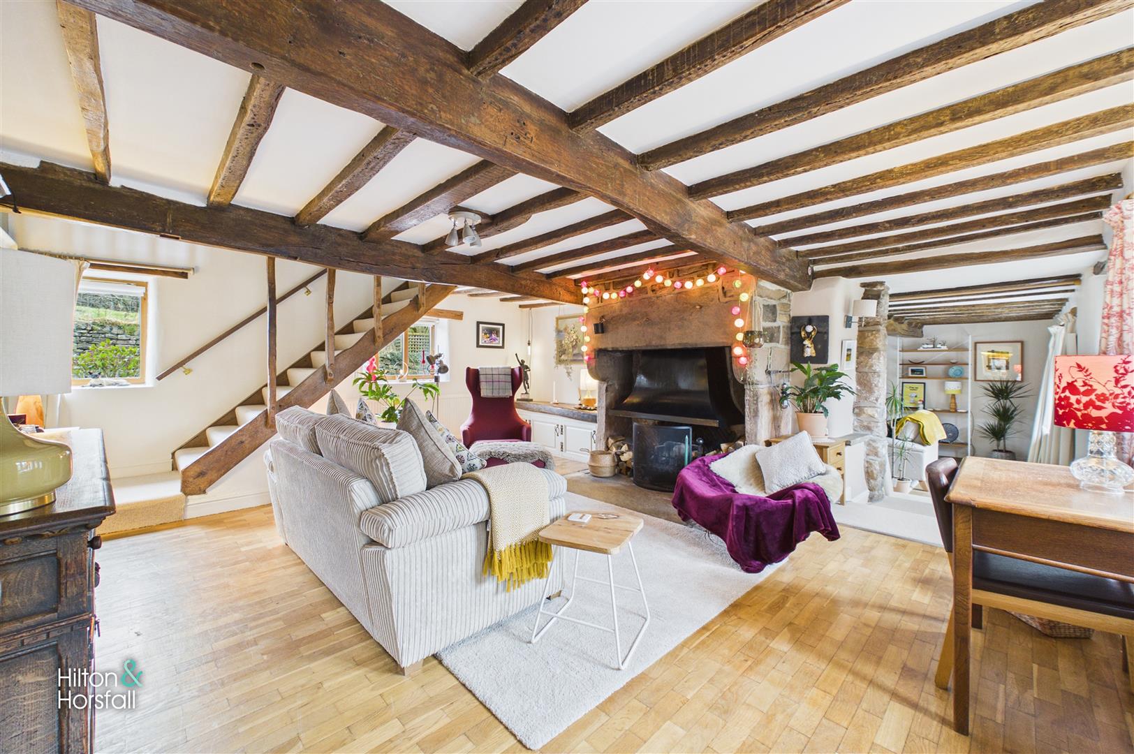 A stunning and characterful sitting room featuring exposed ceiling beams and an impressive stone fireplace with a multi-fuel stove set within, creating a wonderful focal point to the room. The space offers a warm and inviting atmosphere with ample room for seating, making it ideal for relaxing or entertaining. The room provides access through to the dining kitchen and living room, with a staircase leading to the first floor.