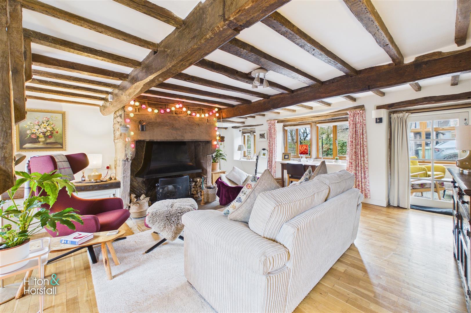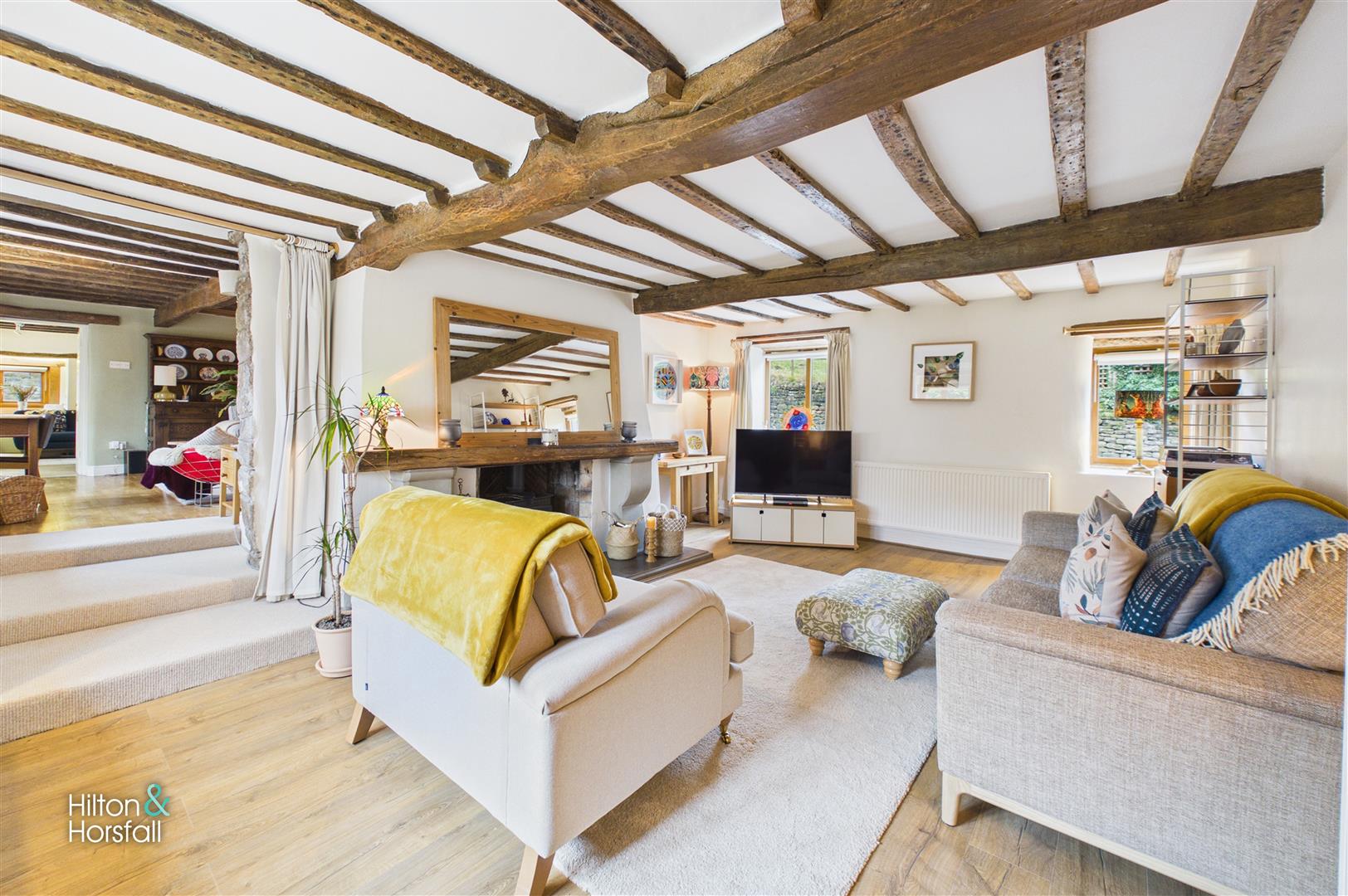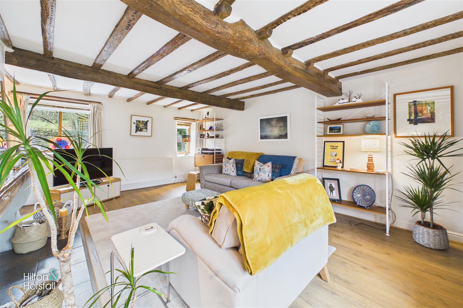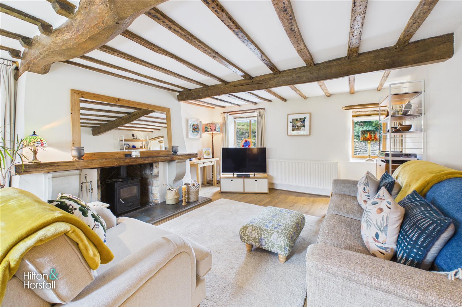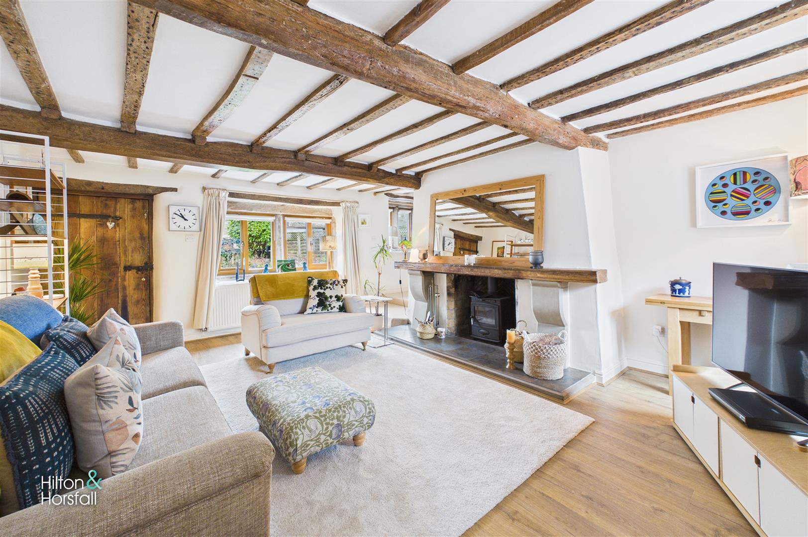 A beautifully presented living room full of charm and character, featuring exposed ceiling beams and a striking stone fireplace with a multi-fuel stove set upon a stone hearth, creating a wonderful focal point to the room. The space offers ample room for comfortable seating and benefits from windows allowing plenty of natural light, enhancing the warm and inviting atmosphere of this delightful cottage reception room.