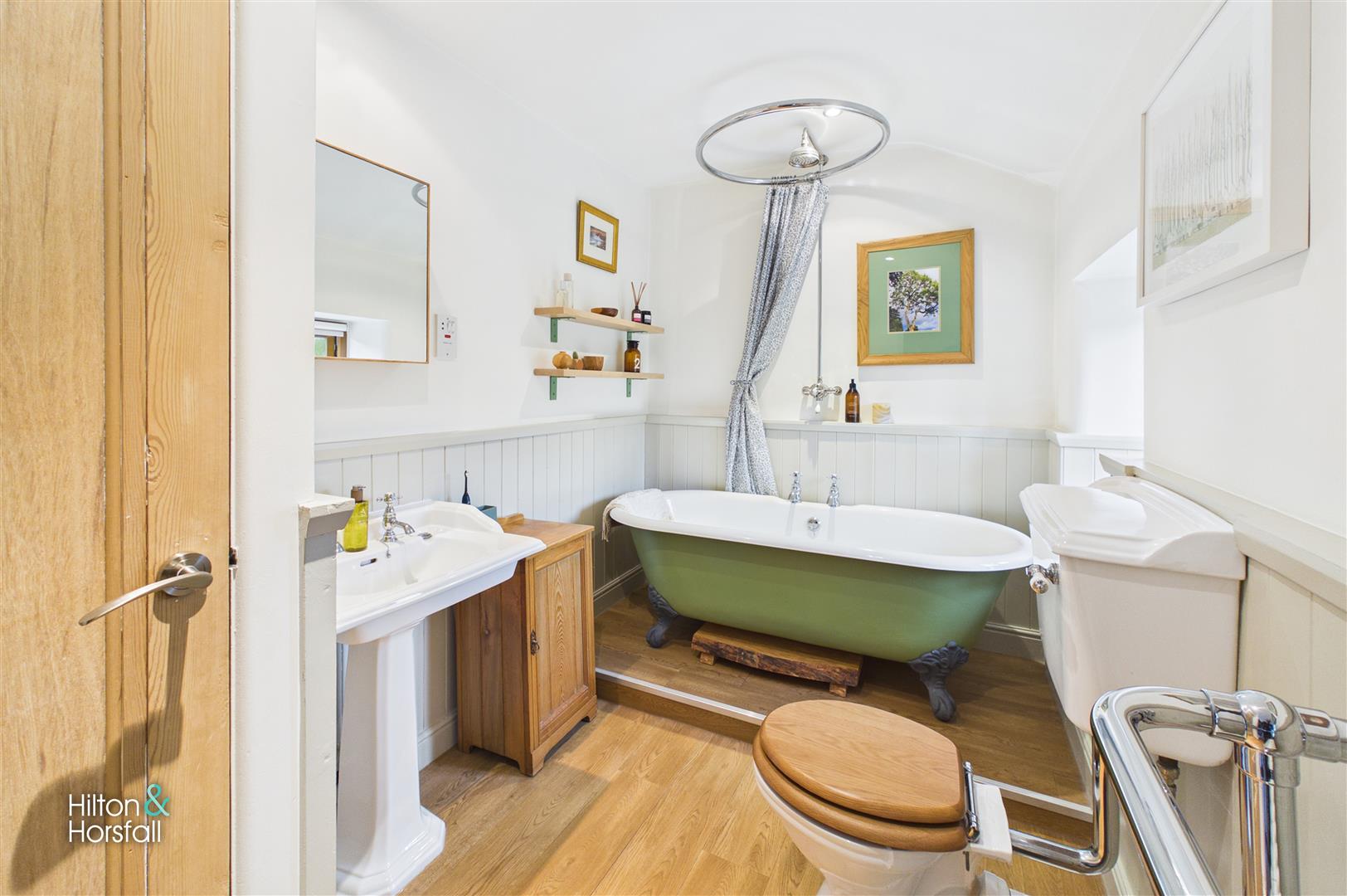 A charming three-piece bathroom suite comprising a freestanding roll-top bath with shower over, pedestal wash basin and low-level WC. The room features attractive panelling and benefits from a window to the front elevation allowing natural light into the space, creating a bright and relaxing environment.