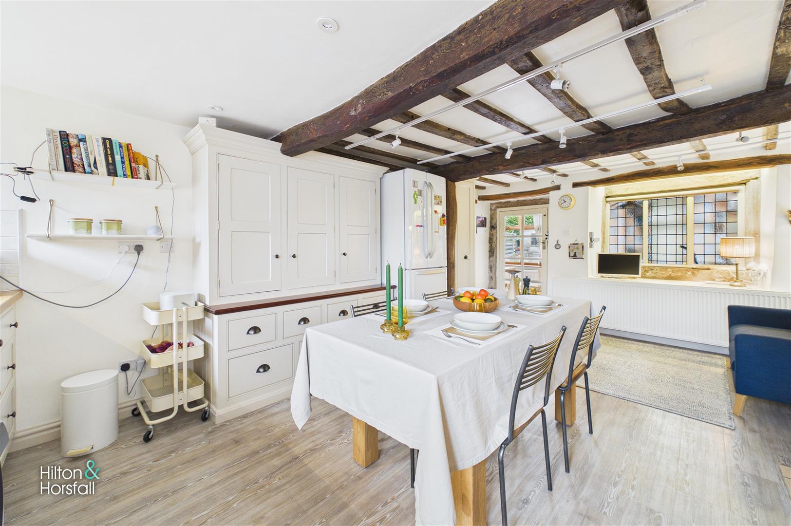 A spacious and characterful dining kitchen forming the heart of the home. The room features exposed ceiling beams and offers ample space for a large dining table, creating a wonderful setting for both everyday living and entertaining. The kitchen is fitted with a range of wall and base units with wooden work surfaces, incorporating a Belfast sink, space for a range cooker with extractor above and additional appliance space. Windows allow natural light to fill the room while enjoying pleasant outlooks, further enhancing the warm and welcoming atmosphere of this charming cottage kitchen.