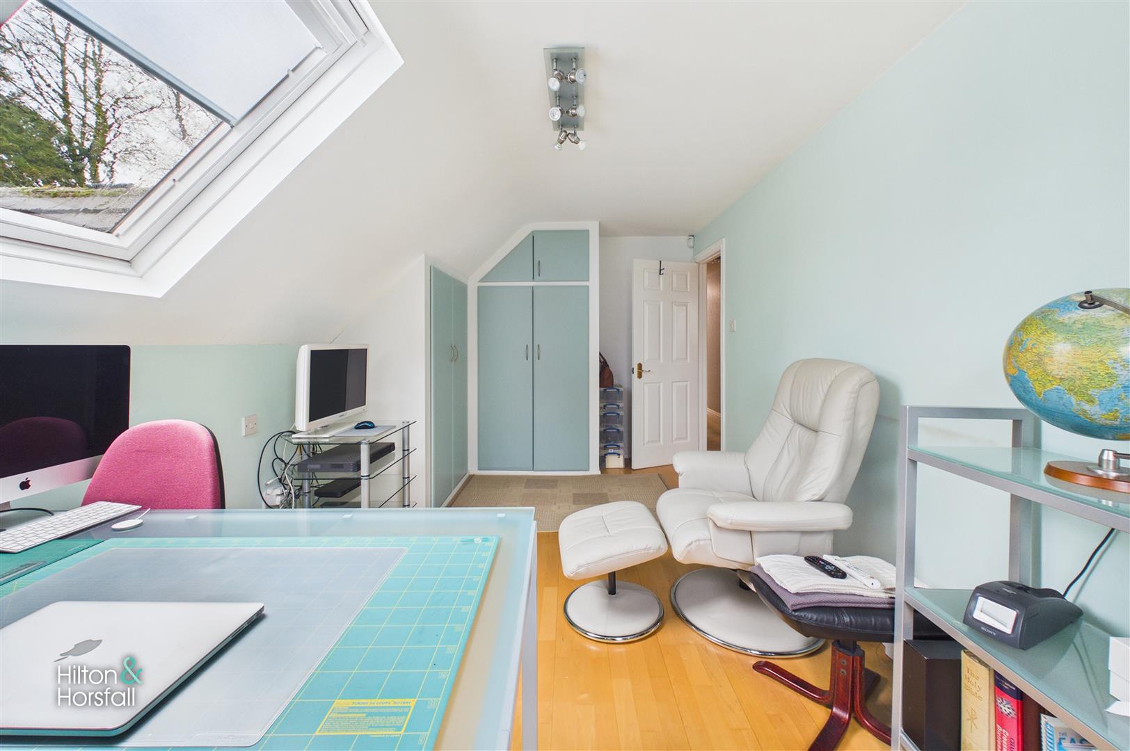 A well-proportioned and versatile room featuring a Velux window and a rear-facing window that together allow for an abundance of natural light. The space is complemented by fitted wardrobes providing excellent built-in storage, while the neutral décor and wood-effect flooring create a bright and airy feel. Ideal for use as a bedroom, home office or hobby room.