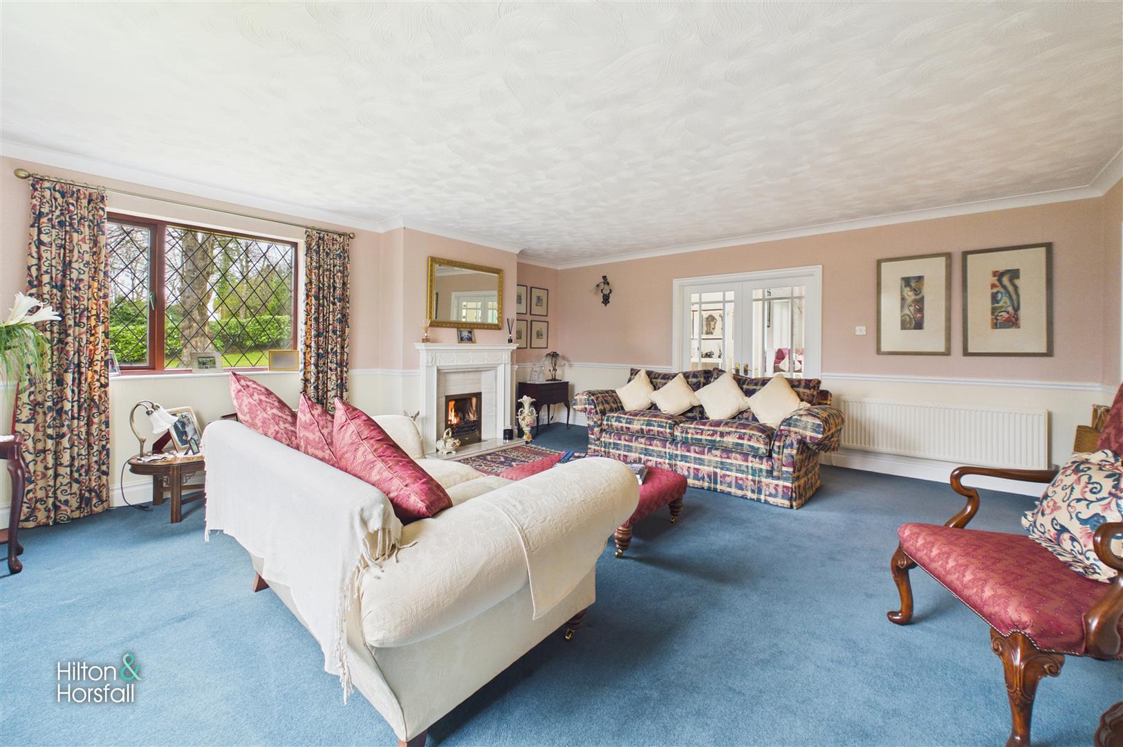 A superb principal reception room of exceptional proportions, the living room offers an elegant and inviting space ideal for both relaxation and entertaining. Beautifully presented, the room features a charming fireplace forming a central focal point, complemented by soft neutral décor and a generous arrangement of windows that flood the space with natural light. The impressive size of the room allows for multiple seating areas, creating a wonderfully versatile environment perfectly suited to modern family living.