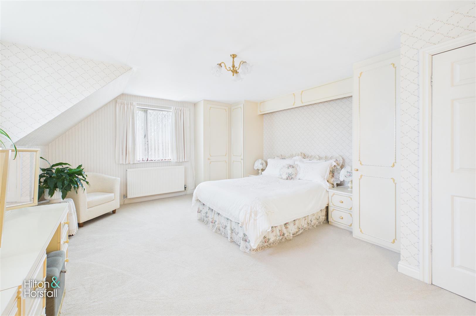An impressive and exceptionally spacious principal bedroom featuring fitted furniture and multiple windows allowing for plenty of natural light. The room provides ample space for wardrobes, seating, and additional bedroom furnishings, creating a comfortable and luxurious retreat.