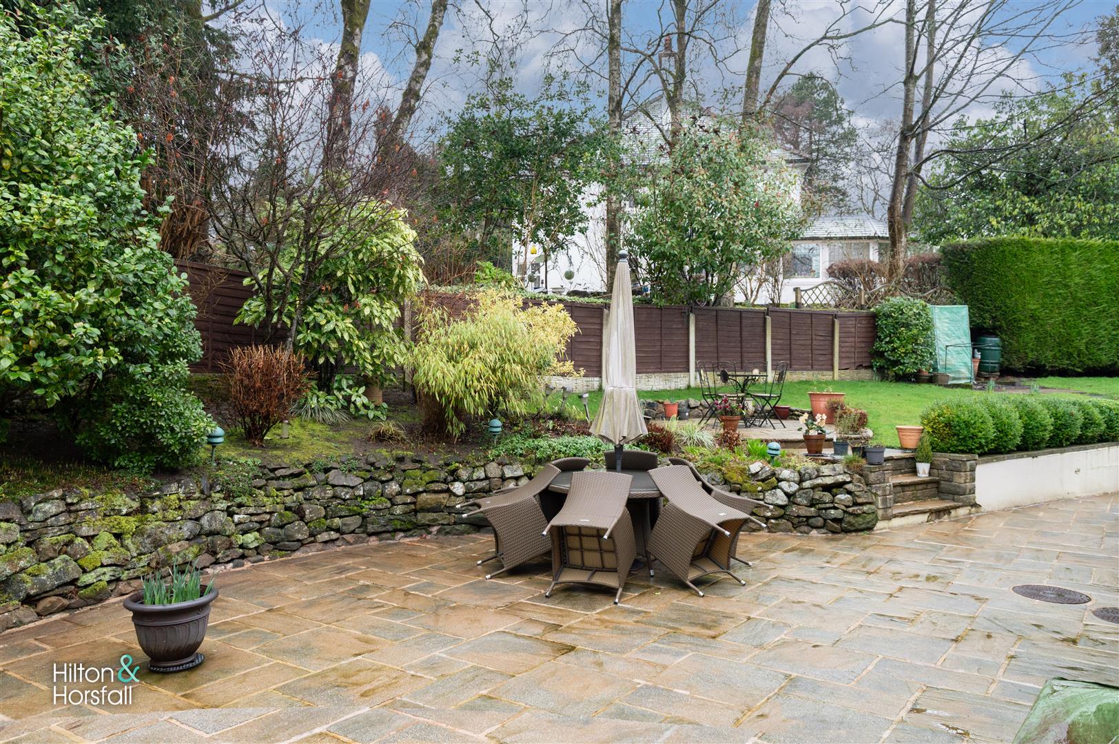 Set within a magnificent plot of approximately 1 acre, the property enjoys extensive wrap-around gardens that create an exceptional sense of space, privacy and seclusion. The grounds are predominantly laid to lawn, complemented by mature trees and established planting, and are further enhanced by a picturesque natural water feature which adds to the peaceful, semi-rural atmosphere. To the rear, a generous patio seating area provides the perfect setting for outdoor dining, entertaining and relaxation, enjoying pleasant views across the gardens. The property is approached via a substantial driveway offering ample parking and leading to the integral double garage.