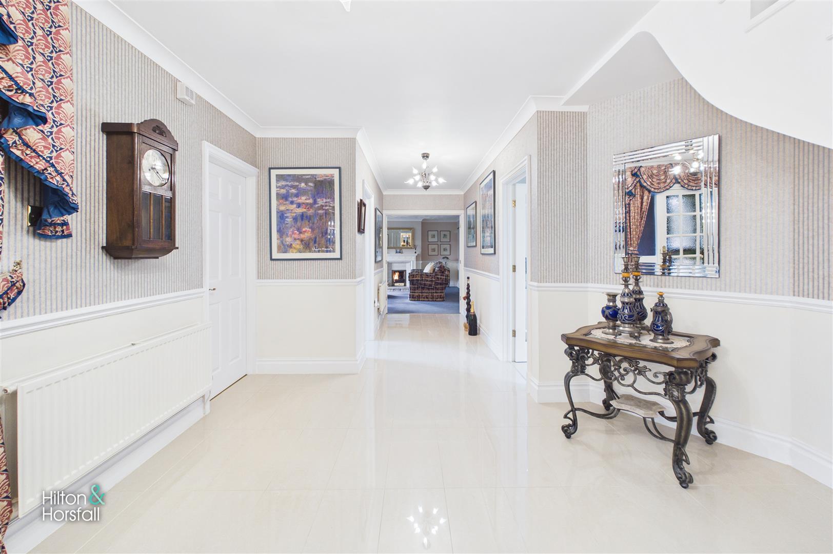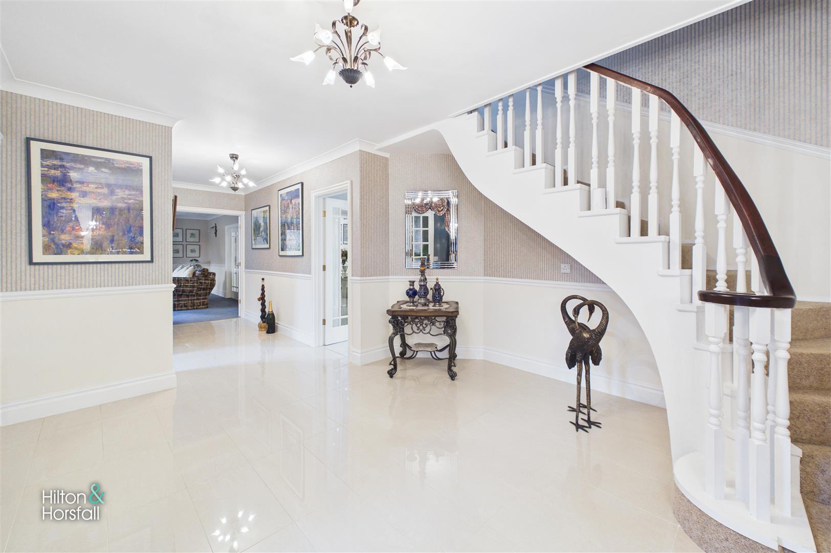 truly impressive introduction to the home, the reception hallway immediately conveys a sense of space and elegance, featuring polished porcelain tiled flooring, refined décor, and a sweeping staircase that creates a striking architectural focal point. Beautifully light and welcoming, this generous entrance sets the tone for the property while providing seamless access to the principal ground floor living accommodation.