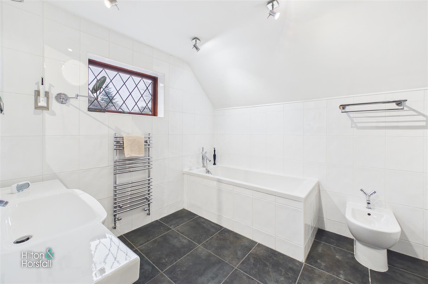 A stylish and generously proportioned bathroom fitted with a modern suite comprising a panelled bath, walk-in shower, vanity wash basin, low-level WC and bidet, complemented by contemporary tiling and quality fittings.