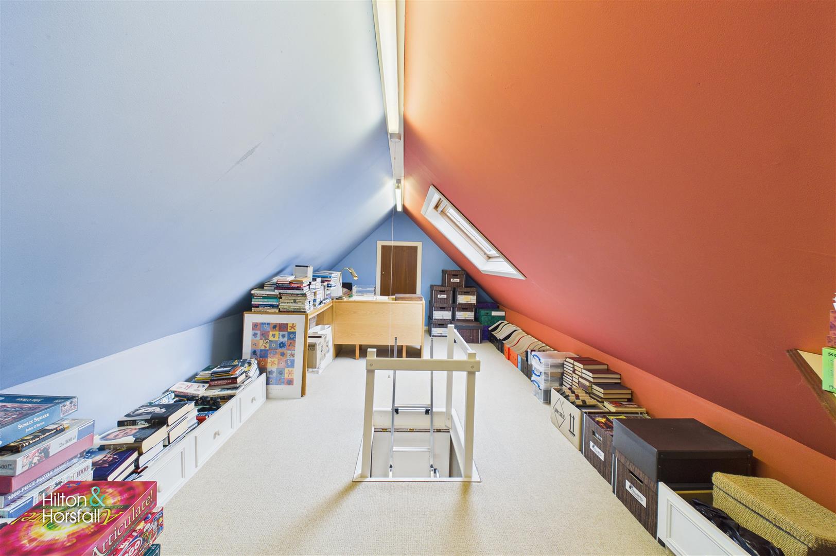 Accessed via a retractable loft ladder from the first-floor landing, this useful attic space provides excellent additional storage, with fitted units and generous eaves storage to either end. Well illuminated and neatly presented, the area offers flexibility for organised household storage, hobbies or occasional use, while remaining clearly defined as a non-habitable loft area.