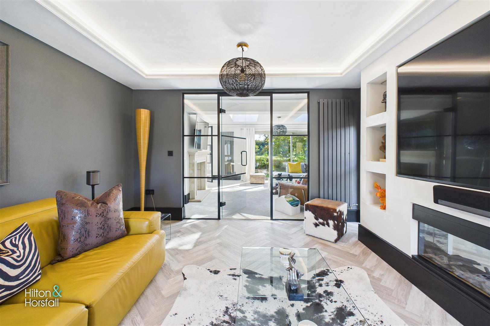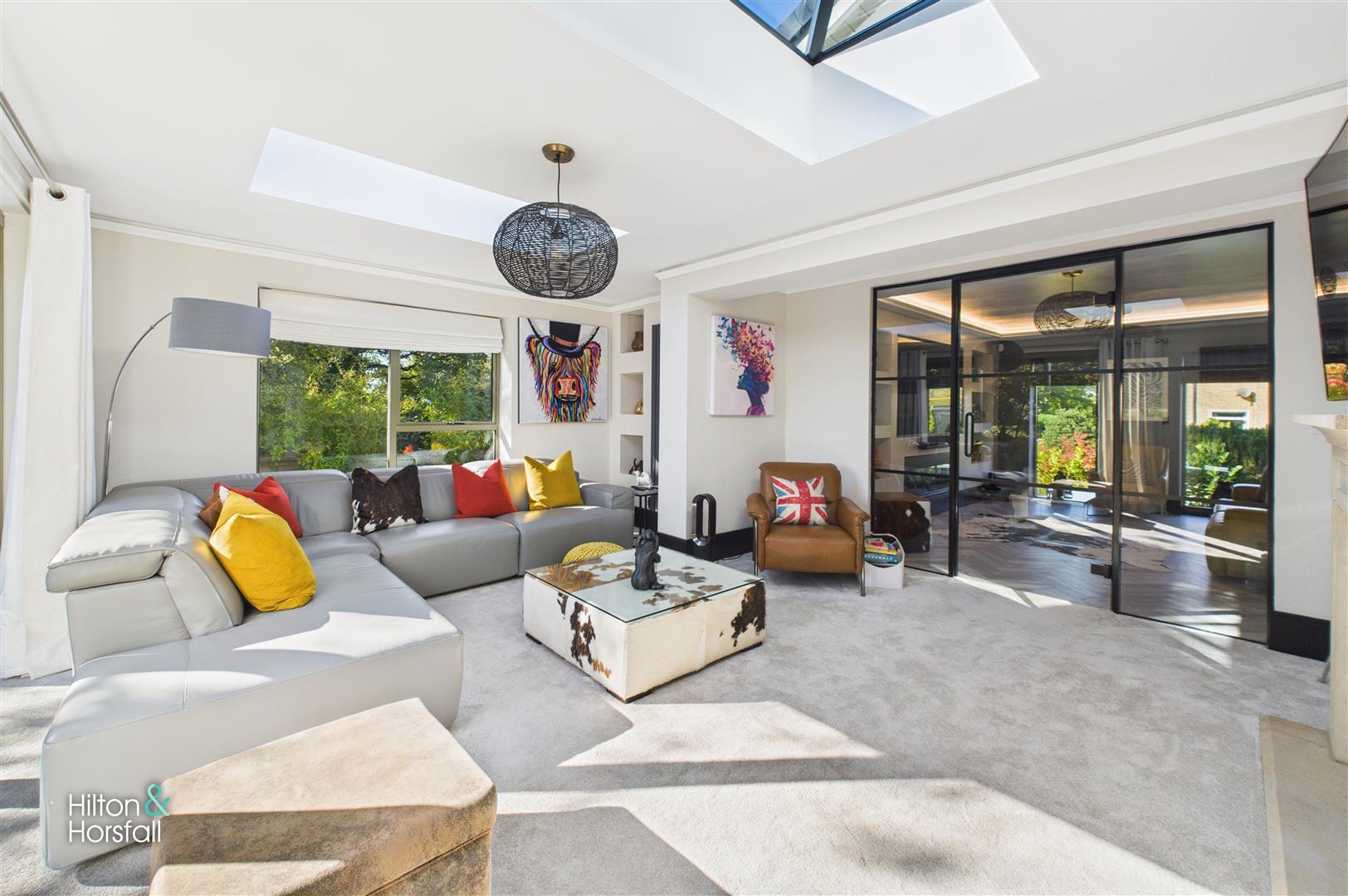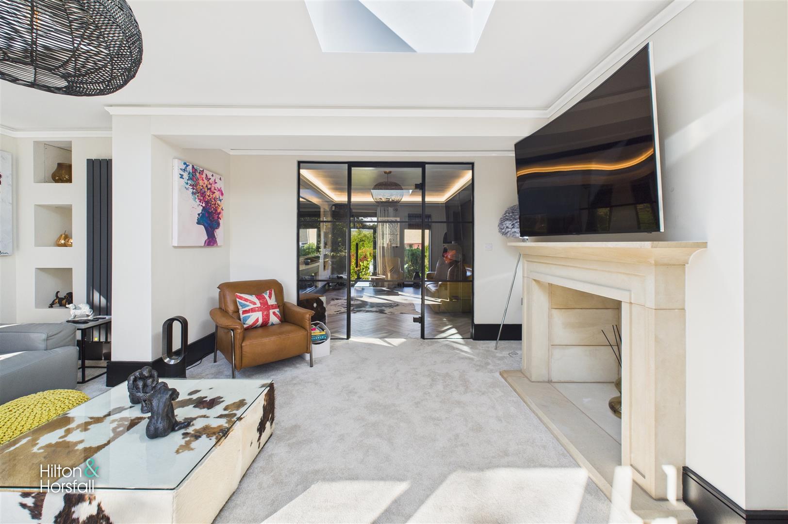 A stunning reception room designed to maximise natural light, featuring two large skylights and full-height glazed doors that open directly onto the landscaped gardens. The room is centred around a contemporary stone fireplace and offers an elegant yet comfortable living space. Stylish décor, recessed shelving, and modern radiators enhance the room’s clean, sophisticated finish.