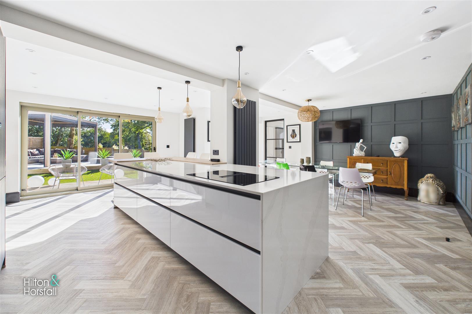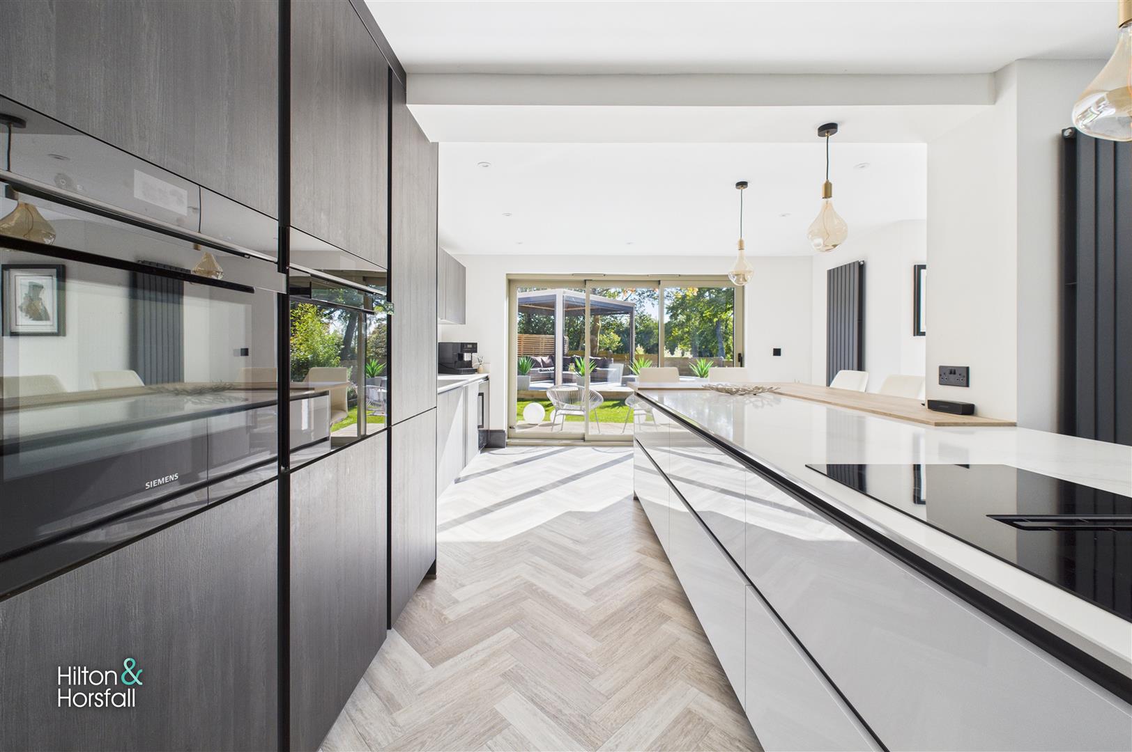 The heart of the home, a truly spectacular open-plan dining kitchen designed for modern family living and entertaining. Fitted with an extensive range of sleek wall, drawer and base units in a contrasting finish, complete with high-spec integrated Siemens appliances and a large central island incorporating a breakfast bar and induction hob. The dining area features full-height sliding glazed doors opening directly onto the landscaped gardens, creating a seamless connection between indoors and outdoors. Statement décor, herringbone flooring, and stylish lighting add to the luxurious feel of this stunning space.