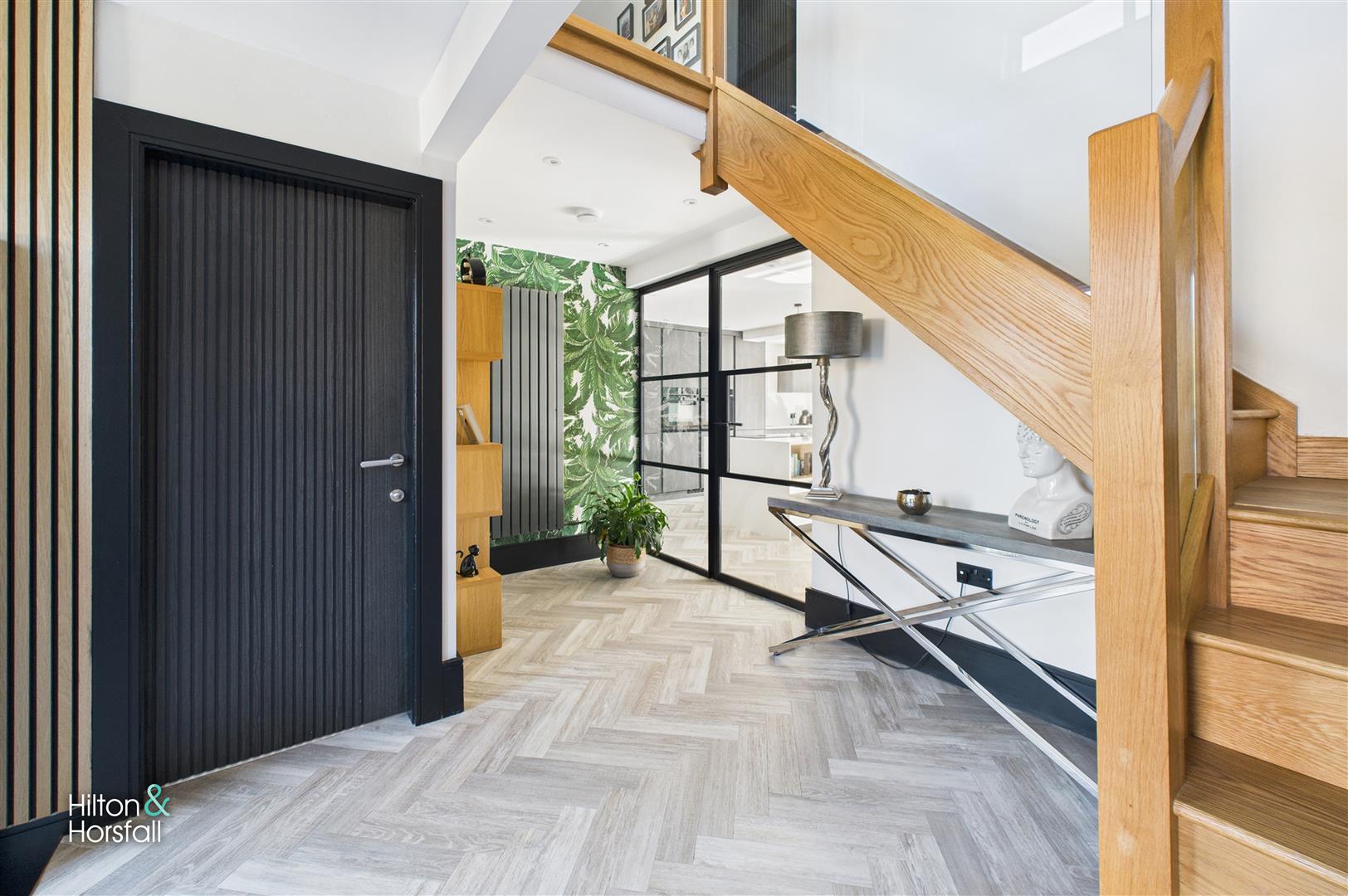 A striking welcome to the home, this impressive hallway showcases the property’s modern design and attention to detail. Featuring a bespoke oak staircase with glass balustrade, contemporary glazed doors, and a stylish herringbone floor, the space sets the tone for the interiors beyond. The hallway is spacious and light-filled, with sleek décor and feature wall panelling that combines elegance with functionality.