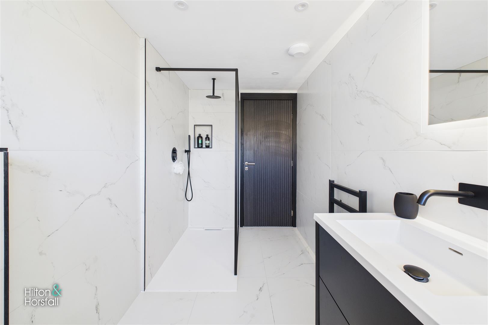 A beautifully designed shower room featuring a contemporary walk-in shower with rainfall head, a sleek vanity unit with double sinks, wall-hung WC, and contrasting black fixtures that complement the modern décor. The room is finished with large-format tiles and inset shelving, creating a stylish and practical family bathroom space.