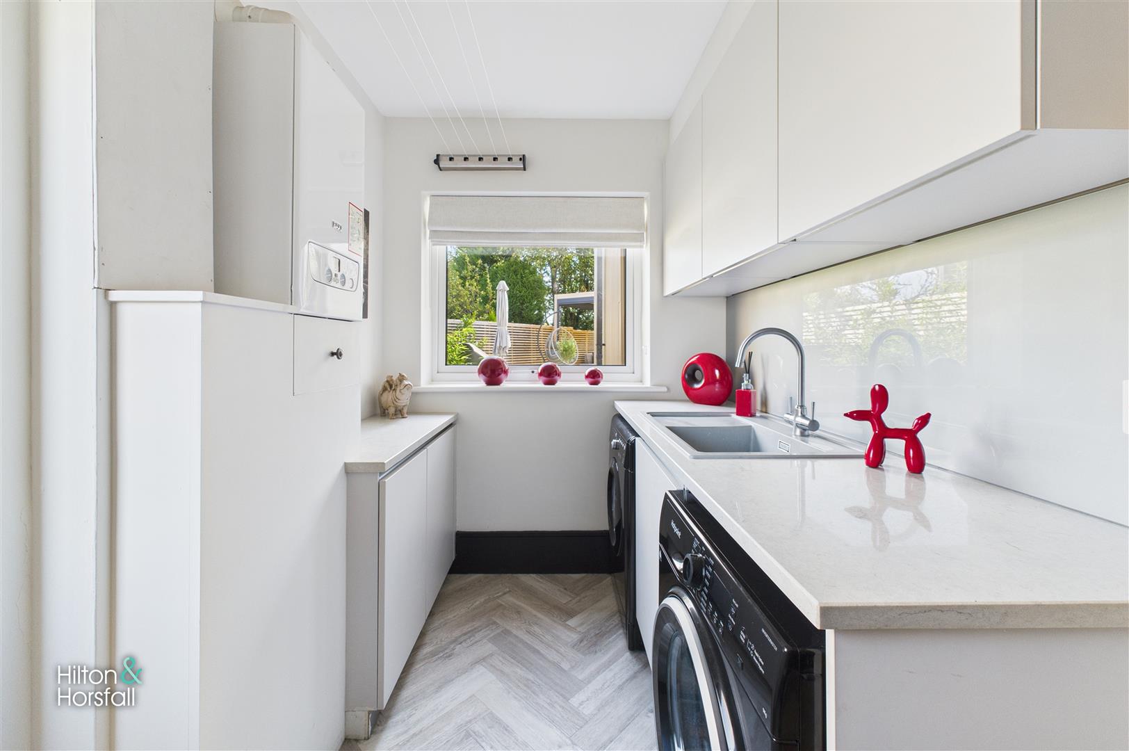 A well-planned utility space fitted with a range of storage cupboards, complementary work surfaces and a stainless steel sink unit. With plumbing and space for appliances, the laundry room provides practicality while maintaining the sleek, modern design seen throughout the home. A window overlooks the rear garden, allowing natural light to flow through.