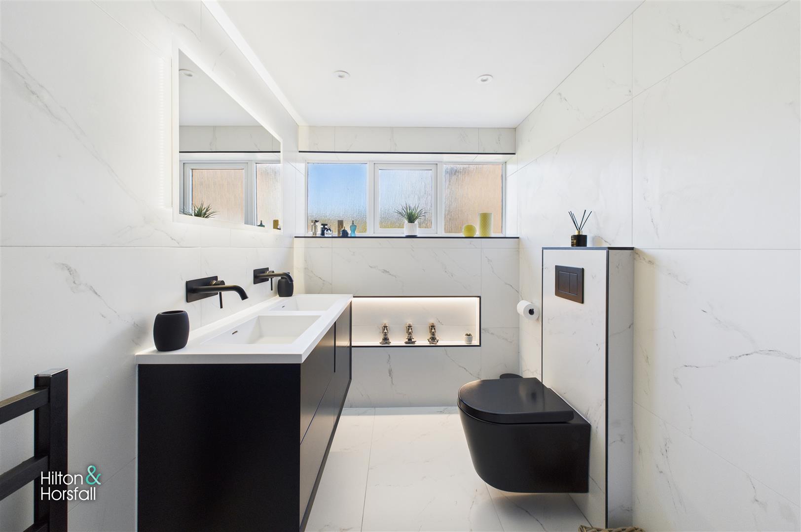 Accessed from the first-floor landing, this versatile study area is bright and contemporary, with a striking feature window overlooking the front garden and beyond. Stylish décor and modern fittings make it a perfect space for home working, reading, or quiet relaxation.