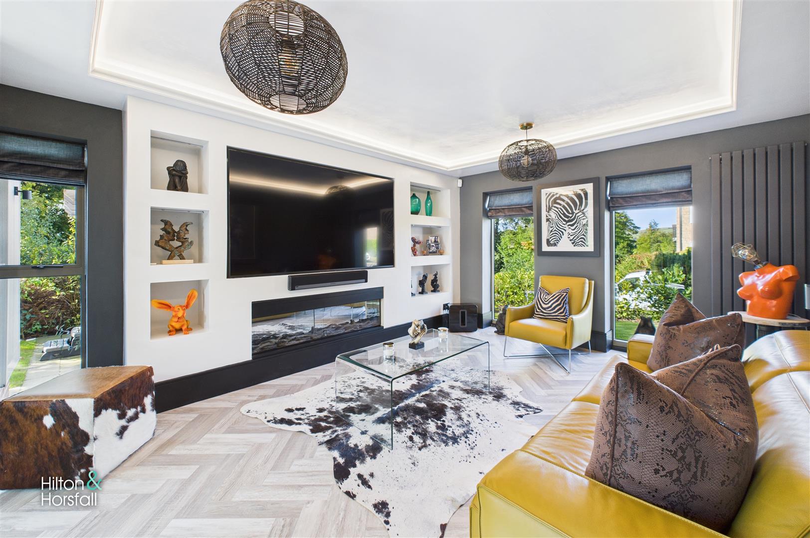 An impressive and versatile reception room, currently styled as a cinema room, perfect for family nights in or entertaining guests. Featuring a large built-in media wall with recessed shelving, integrated fireplace, and space for a widescreen TV, this room combines modern design with comfort. Floor-to-ceiling windows bring in natural light, while the feature lighting and herringbone flooring complete the contemporary finish.